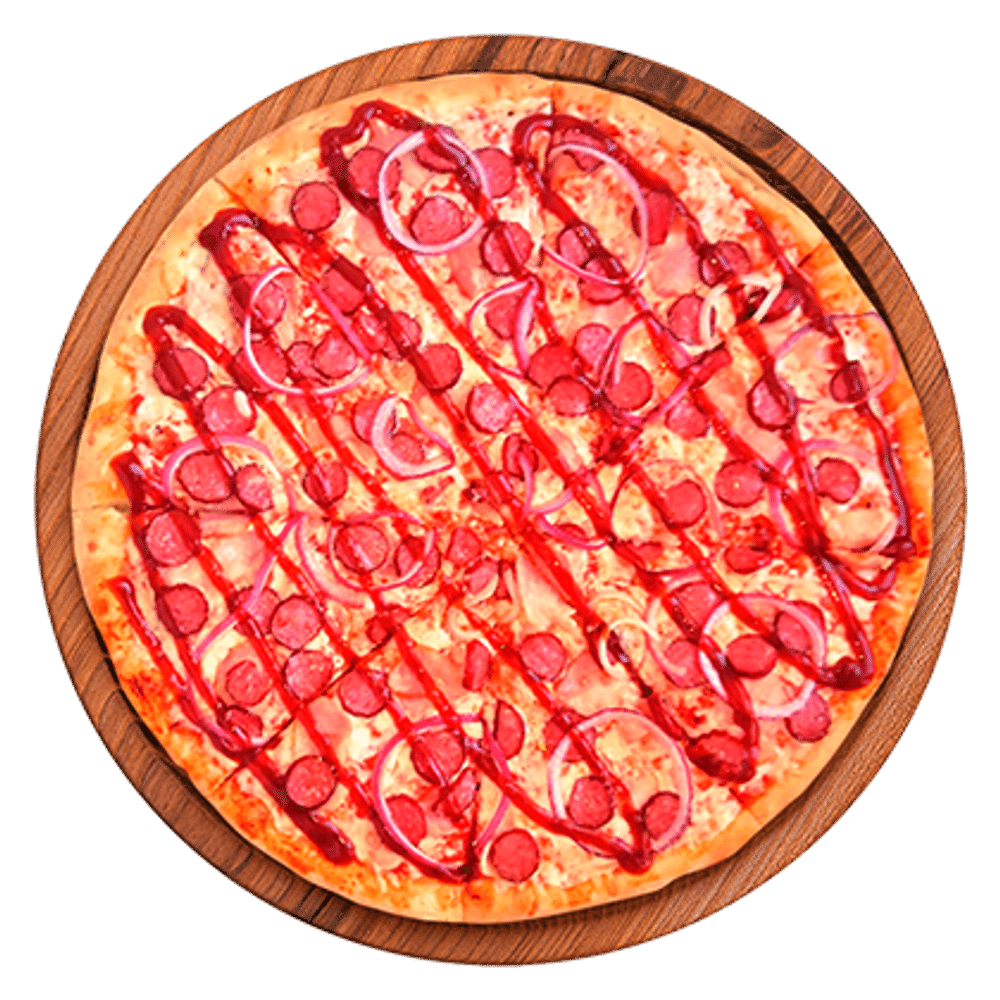Соус томатный, сыр моцарелла, бекон, колбаски охотские, красный лук, соус барбекю.
