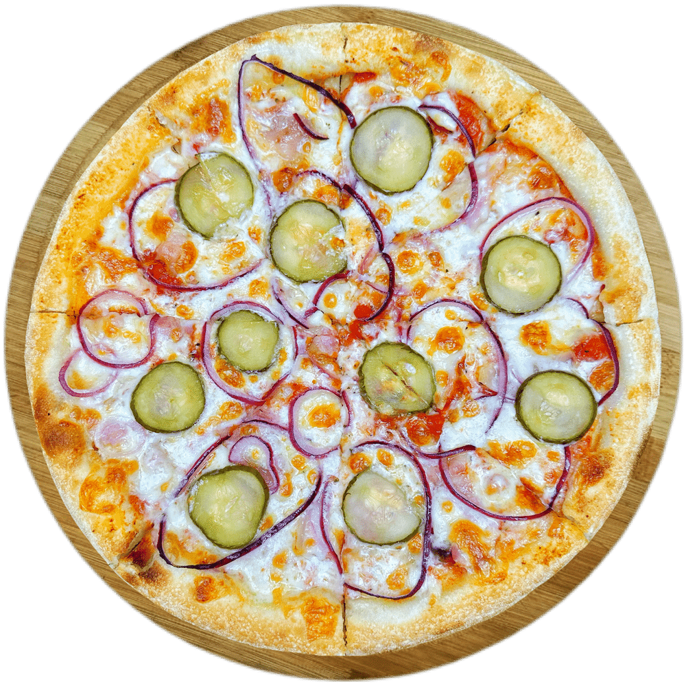 Соус томатный, бекон, красный лук, маринованные огурцы, сыр моцарелла.