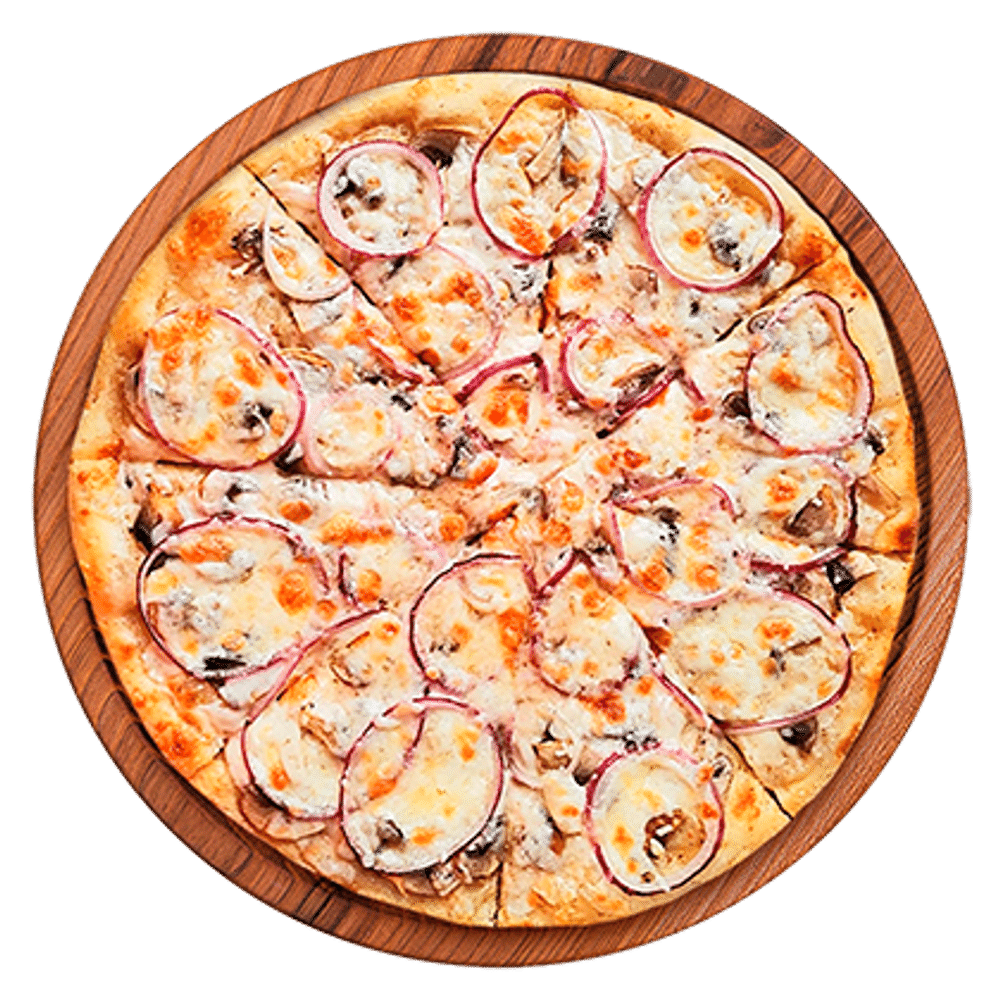 Соус сливочный, шампиньоны, красный лук, увеличенная порция моцареллы.