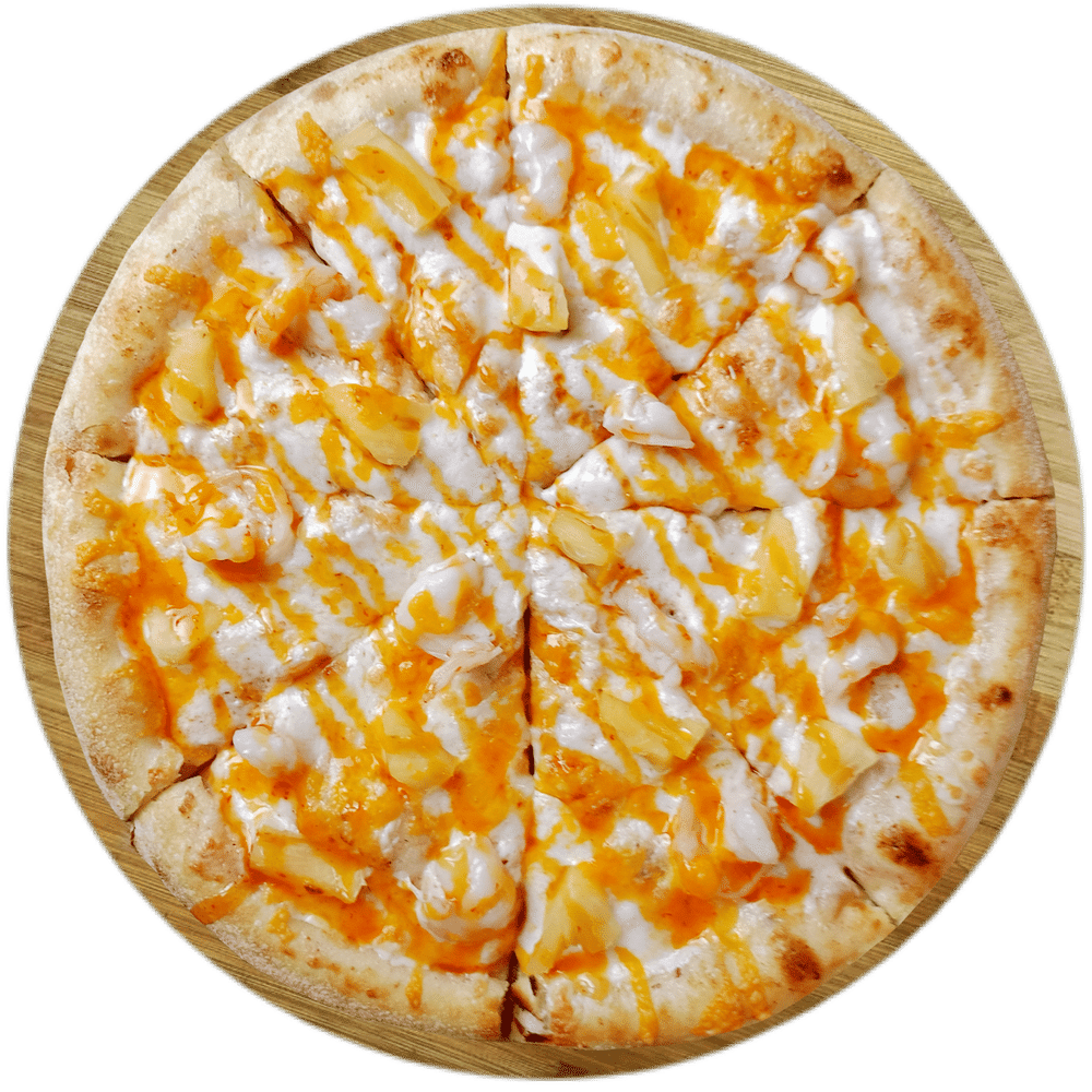 Соус сливочный,сыр моцарелла, ананас консервированный, креветки, сыр чеддер, соус чили- манго.