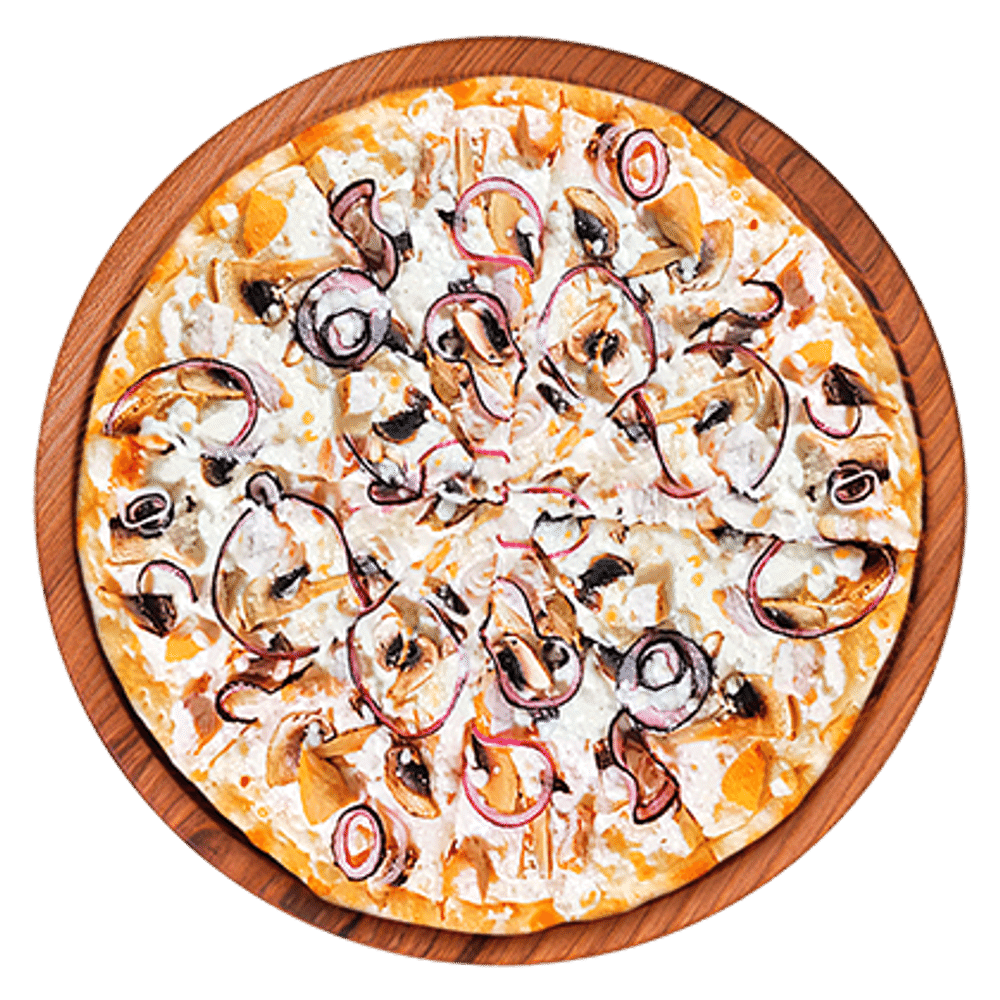 Сыр моцарелла, соус сливочный, шампиньоны, курица, лук репчатый.