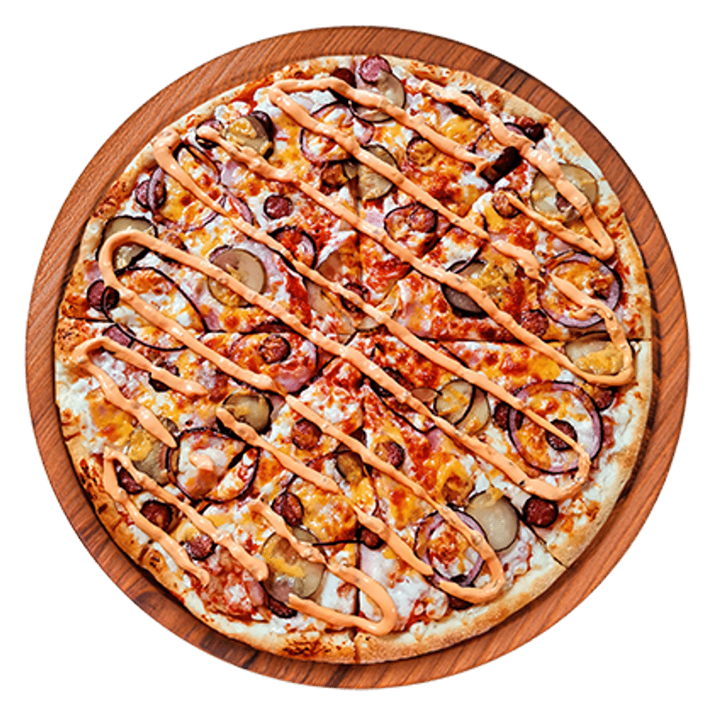 Соус томатный, сыр моцарелла, лук репчатый, маринованные огурцы, охотничьи колбаски, бекон, сыр чеддер, соус бургерный.