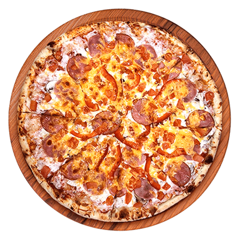 Соус томатный, сыр моцарелла, шампиньоны, салями, ветчина, томаты, перец болгарский, сыр чеддер.